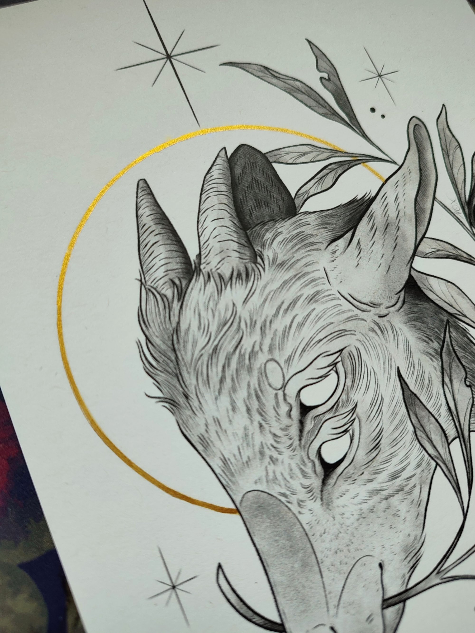 A baby goat print with gold embellishments (since they are all done by hand they can be ever so slightly different from the example you see in this listing) - high quality A5 print on slightly textured 100% recycled paper, ready to be framed.