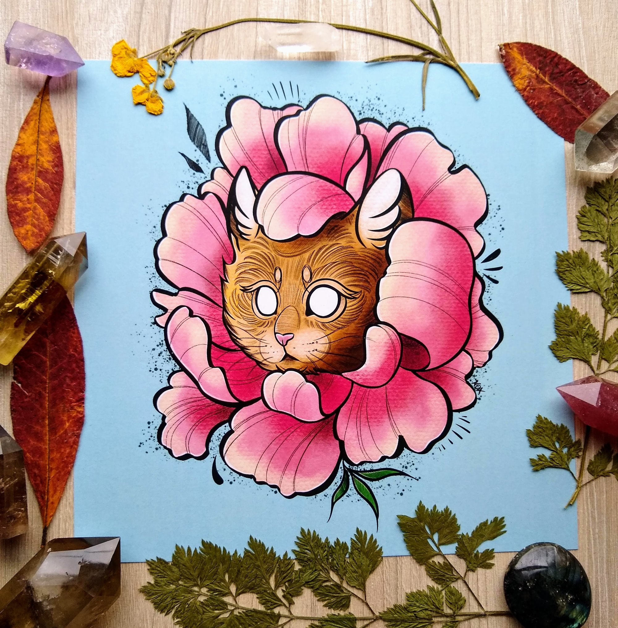 Flower Kitty - high quality square print on a heavyweight smooth paper, ready to be framed.