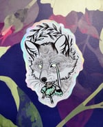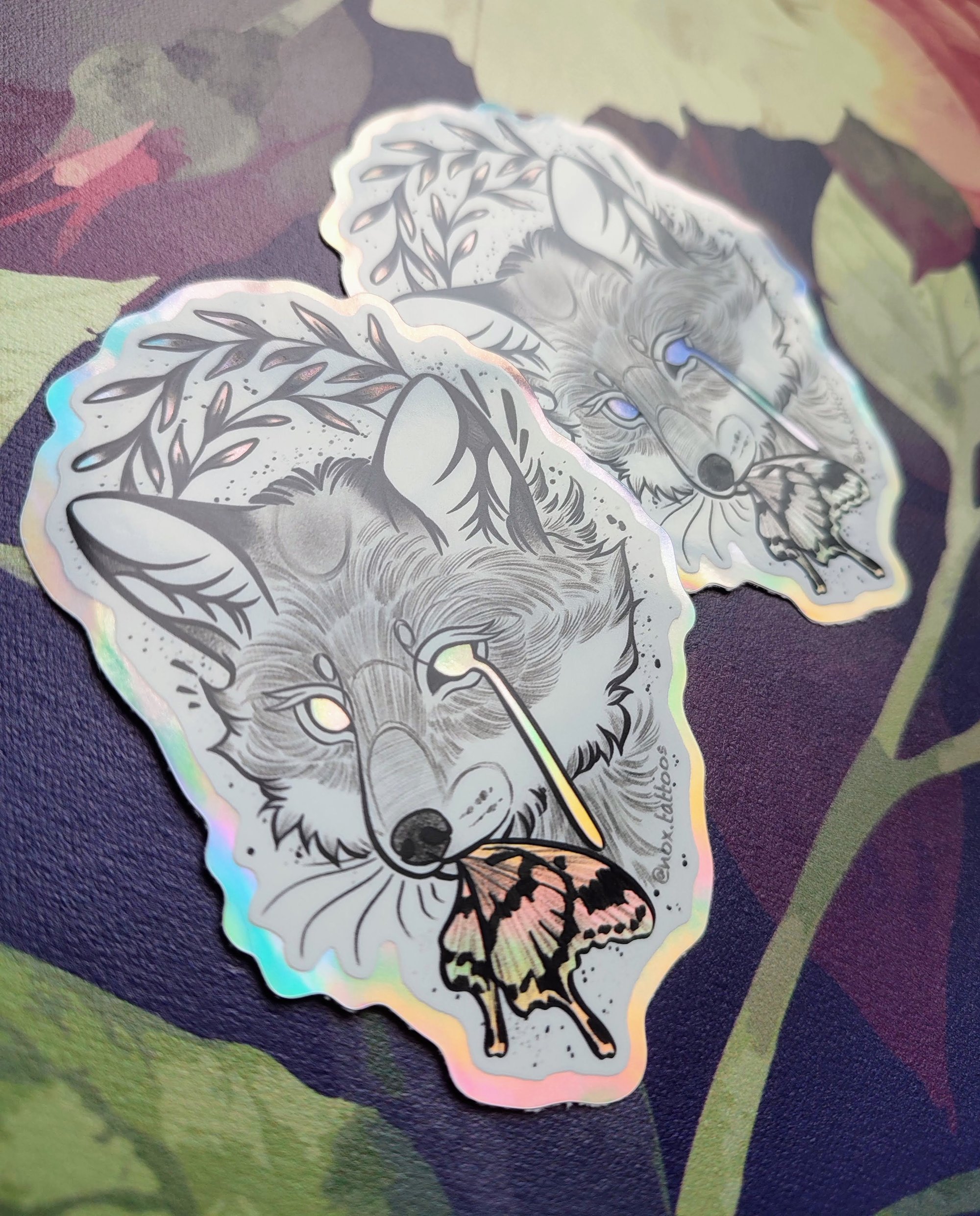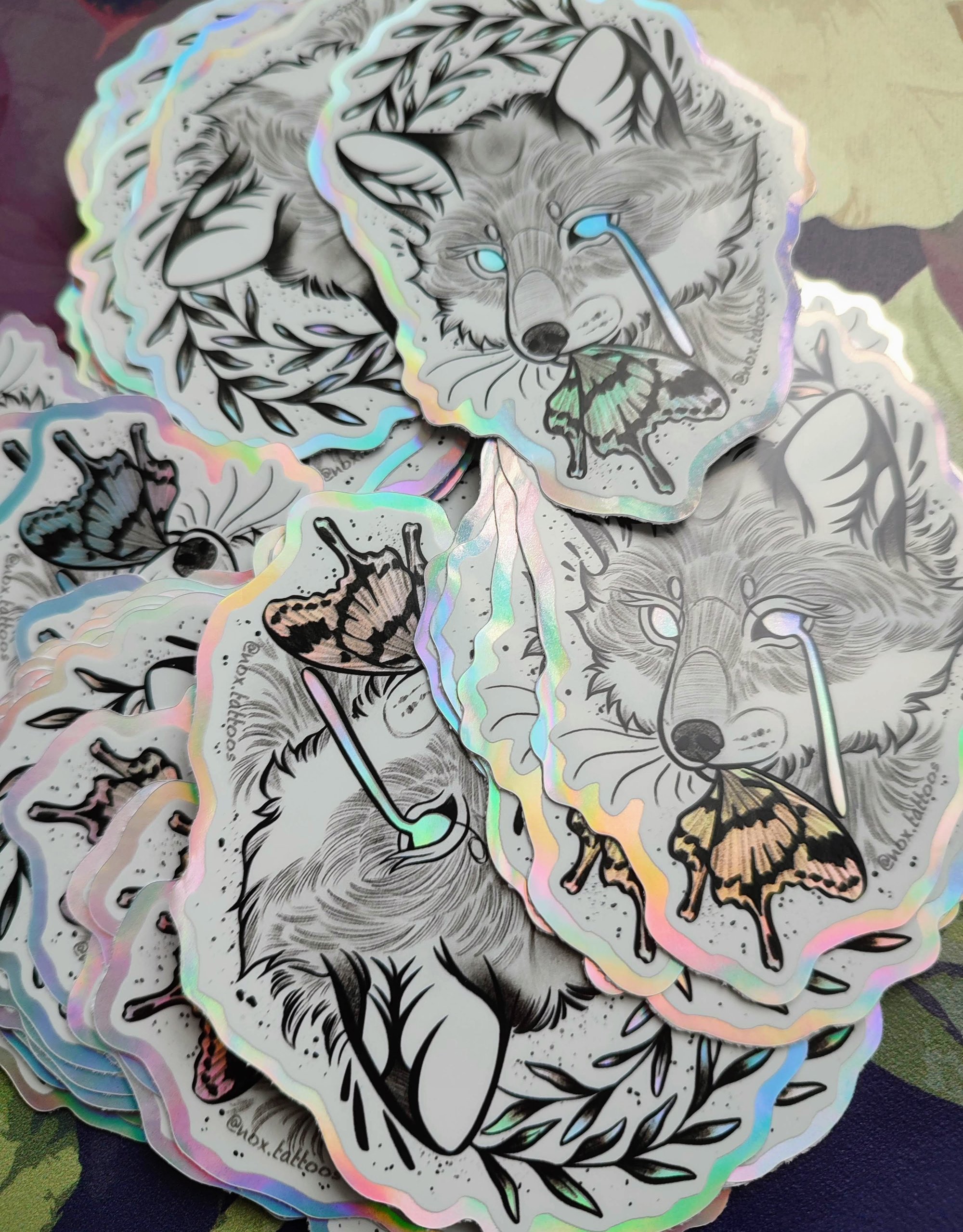 Holographic sticker - a fox with a moth. The holo effect is in the eyes, moth, leaves and the sticker border.